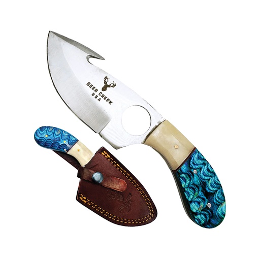 Split-Ridge Instinctive-Control Gut Hook Hunting Knife - Blue Pakkawood & Bone
